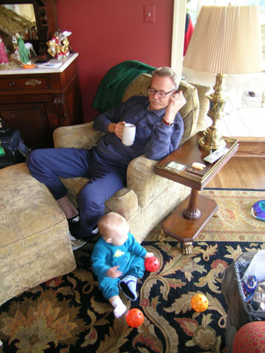 With Jen's dad, coffee in hand, grasping at consciousness.