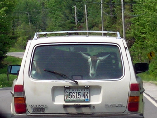 Maine 2007/10 Got Goat?Previous | Home | NextTaken through the windshield of our car, driving near the Howe's in Thorndike, ME. I have not altered the image in any way. There were also two of her kids in the wagon. This is why my parents always made sure we got out of NYC ocassionally. |