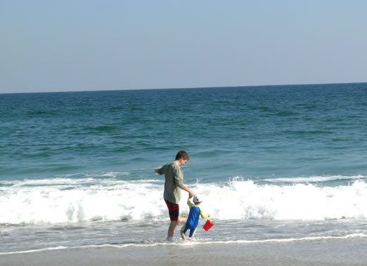 He was knocked on his bum by a rogue wave at 18 months. Took him a while to go back into the water - but we still like to hold hands in the surf. Hope he never outgrows it.